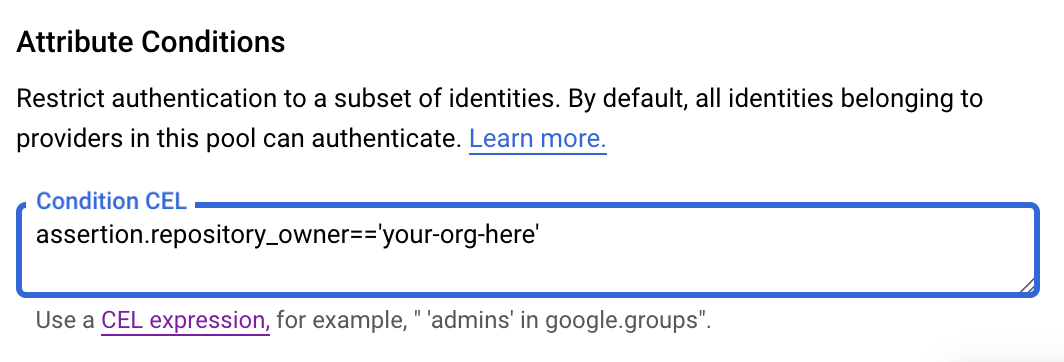 Let's briefly go over a solution that provides some security with minimal overhead. Rather than allowing any GitHub Action to use our WIF pool, we can restrict it to only be allowed from repositories in our GitHub organisation.